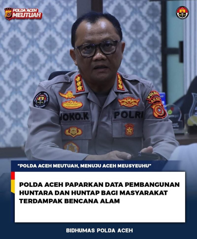 Banda Aceh — Kepolisian Daerah (Polda) Aceh memaparkan data pembangunan hunian sementara (Huntara) dan hunian tetap (Huntap) bagi masyarakat yang terdampak bencana alam di sejumlah wilayah Provinsi Aceh.