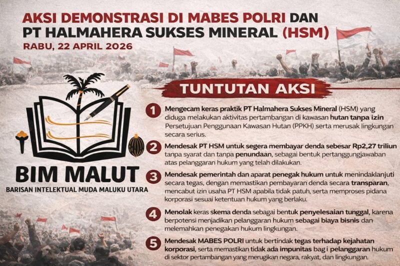 Jakarta — Barisan Intelektual Muda Maluku Utara (BIM-MALUT) memastikan akan menggelar aksi demonstrasi pada Rabu, 22 April 2026, sebagai bentuk tekanan terbuka terhadap dugaan praktik pertambangan ilegal yang dilakukan oleh PT Halmahera Sukses Mineral (HSM). Aksi ini juga diarahkan ke Mabes Polri sebagai simbol desakan agar aparat penegak hukum tidak lagi bersikap pasif dalam menangani kasus kejahatan lingkungan berskala besar.