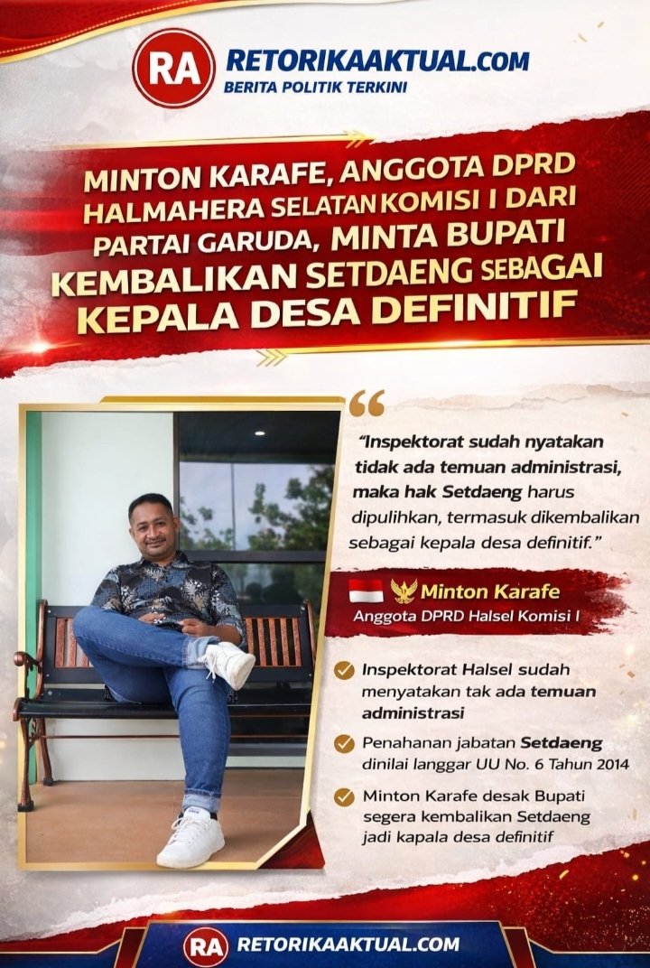 RETORIKAAKTUAL.COM HALMAHERA SELATAN — Anggota DPRD Kabupaten Halmahera Selatan dari Partai Garuda, Komisi I, Minton Karafe, meminta Bupati Halmahera Selatan segera mengembalikan Zet Daeng sebagai Kepala Desa definitif. Permintaan tersebut disampaikan karena secara administrasi dan hukum, Zet Daeng dinyatakan tidak terbukti melakukan pelanggaran.