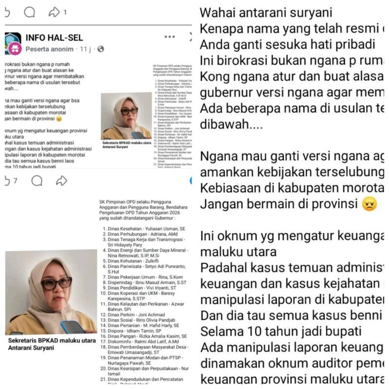 Ternate, Maluku Utara — Nama Sekretaris Badan Pengelola Keuangan dan Aset Daerah (BPKAD) Provinsi Maluku Utara menjadi perhatian publik setelah unggahan dari akun Facebook anonim beredar dan menuding adanya dugaan perubahan sepihak terhadap nama pimpinan Organisasi Perangkat Daerah (OPD) yang telah ditetapkan dalam Surat Keputusan (SK) Gubernur Maluku Utara untuk Tahun Anggaran 2026.