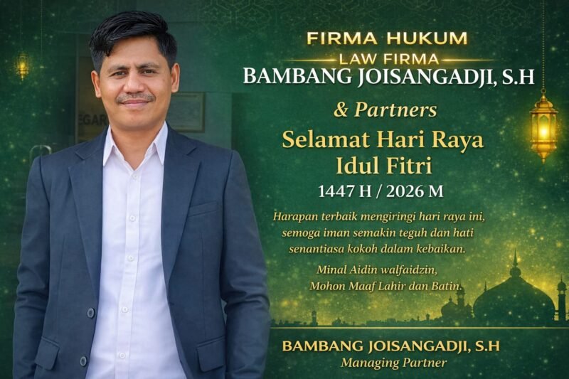 Halmahera Selatan — Dalam rangka menyambut Hari Raya Idul Fitri 1447 Hijriah/2026 Masehi, Firma Hukum Bambang Joisangadji, S.H & Partners menyampaikan ucapan selamat kepada seluruh umat Muslim, khususnya masyarakat di wilayah Halmahera Selatan dan Maluku Utara.
