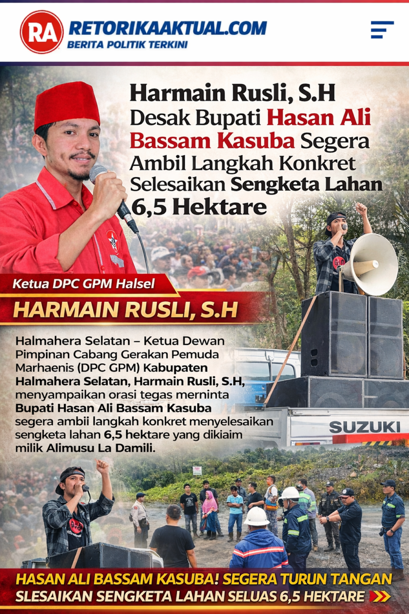 Halmahera Selatan – Ketua Dewan Pimpinan Cabang Gerakan Pemuda Marhaenis (DPC GPM) Kabupaten Halmahera Selatan, Harmain Rusli, S.H, menyampaikan orasi tegas terkait sengketa lahan seluas 6,5 hektare yang diklaim sebagai milik Bapak Alimusu La Damili. Dalam penyampaiannya, Harmain Rusli meminta Bupati Halmahera Selatan, Hasan Ali Bassam Kasuba, agar segera turun tangan dan mengambil langkah konkret untuk menyelesaikan persoalan tersebut.