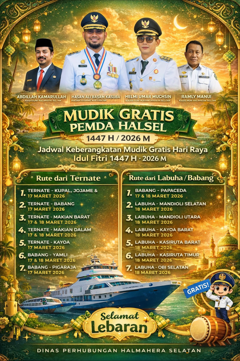 Halmahera Selatan – Menjelang perayaan Hari Raya Idul Fitri 1447 Hijriah atau tahun 2026 Masehi, Pemerintah Kabupaten Halmahera Selatan kembali menghadirkan program Mudik Gratis bagi masyarakat. Program ini menjadi salah satu bentuk kepedulian pemerintah daerah dalam membantu warga yang ingin pulang kampung untuk merayakan Lebaran bersama keluarga tanpa harus terbebani biaya transportasi.