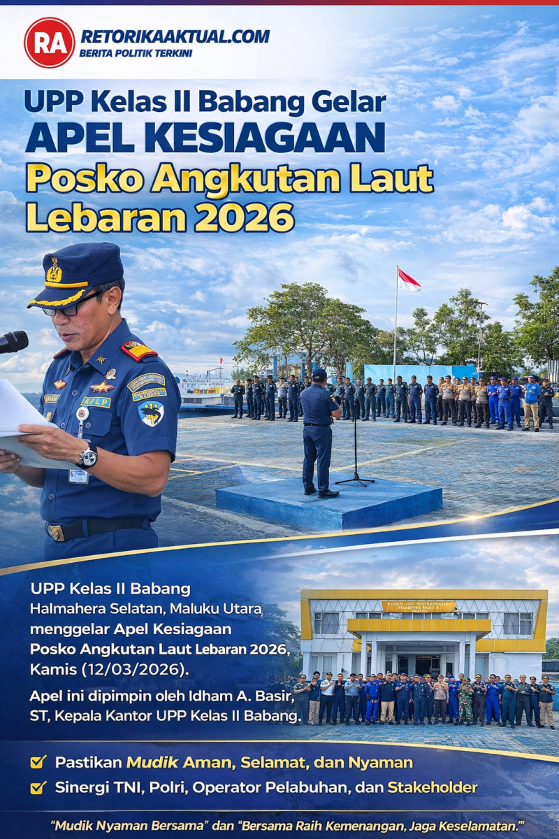 Halsel Kepala Kantor Unit Penyelenggara Pelabuhan (UPP) Kelas II Babang, Idham A. Basir, ST, memimpin pelaksanaan Apel Kesiagaan Posko Penyelenggaraan Angkutan Laut Lebaran Tahun 2026 (1447 H) yang digelar di Lapangan Apel Kantor UPP Kelas II Babang Kabupaten Halmahera Selatan Provinsi Maluku Utara, Kamis (12/3/2026) pukul 16.30 WIT hingga selesai.